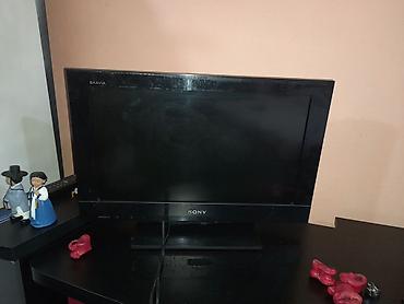 Телевизор Sony BRAVIA, антенна, стол, компактная диагональ около 22–24". Плоская ЖК‑панель, черная глянцевая рамка, настольная подставка в комплекте.