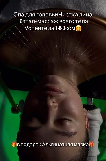 - Специальный релакс-комплекс: спа для головы + чистка лица 16 этапов + массаж всего тела. Цена: 1990 сом. Подарок: альгинатная маска.