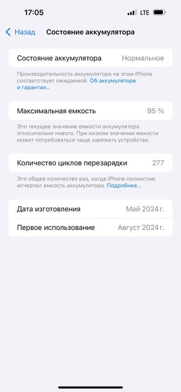 - Аккумулятор: максимальная емкость 95%, 277 циклов перезарядки.