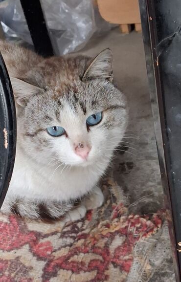 - Окрасы: бело-серый (пятнистый), серо-полосатый табби с белыми отметинами, а также светлый кот с голубыми глазами.