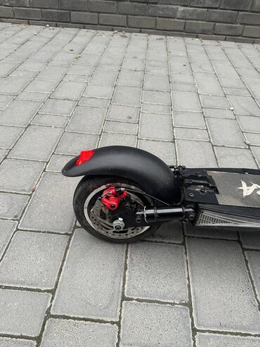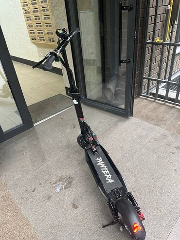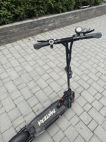 Электрический самокат Pantera черного цвета с мощным двигателем и прочной конструкцией. Модель оснащена дисковыми тормозами, что обеспечивает эффективное и безопасное торможение. Широкая платформа для ног и удобный руль с приборной панелью делают поездки комфортными. Самокат подходит для городских поездок и прогулок. Заднее колесо с крылом и стоп-сигналом обеспечивает дополнительную безопасность. Рулевая колонка имеет витые провода, придающие самокату футуристичный вид. Надежное транспортное средство для повседневного использования.