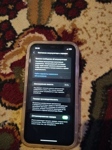 - Состояние аккумулятора на скриншоте: максимальная ёмкость 73%, включена оптимизированная зарядка; отображается системное уведомление о необходимости сервиса для восстановления полной ёмкости.