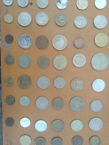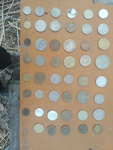 - Подборка разномастных монет: СССР, Россия, страны Восточной Европы и др. Видны номиналы 1, 2, 3, 5, 10, 20, 50 (копеек/центов/шиллингов и т.п.), в том числе советские 1–5 копеек и рубли, российские 5–10 рублей ранних выпусков, иностранные круглые и многогранные монеты.