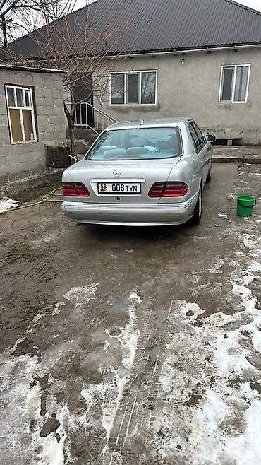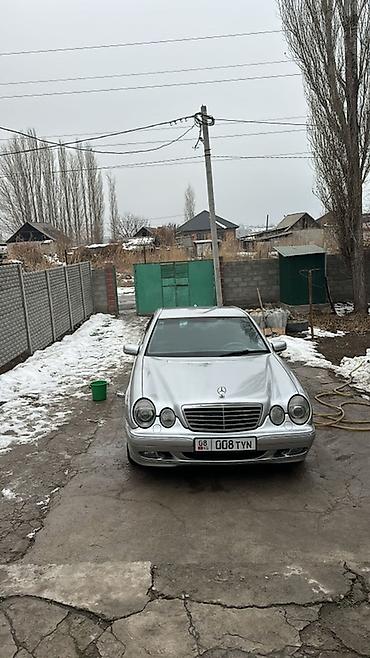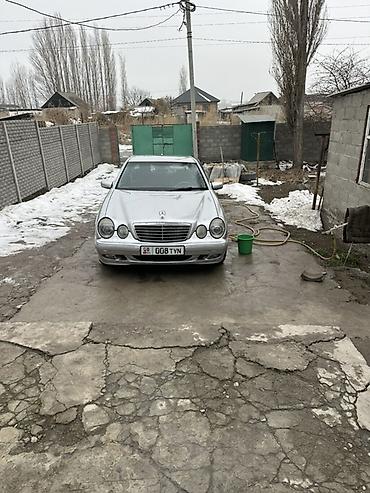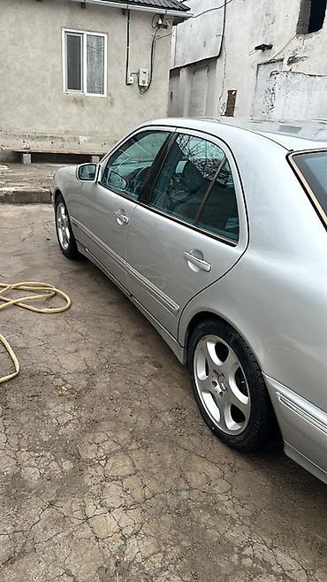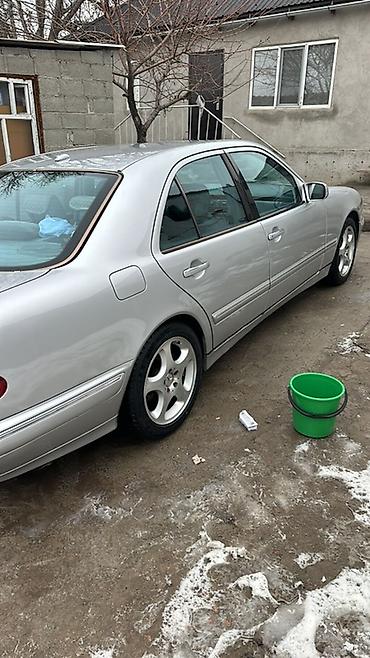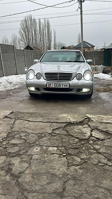 Mercedes‑Benz E‑Class (W210) седан, серебристый цвет кузова. Классический дизайн с двойной круглой оптикой, фирменная решетка радиатора и шильдик на капоте. На фото установлены оригинальные легкосплавные диски Mercedes, низкий передний бампер с противотуманными фарами, зеркала и дверные молдинги в цвет кузова. Четырехдверный салон, тонированные стекла заднего ряда. Передняя оптика и ходовые огни исправно светят. Номера формата KG на переднем бампере.