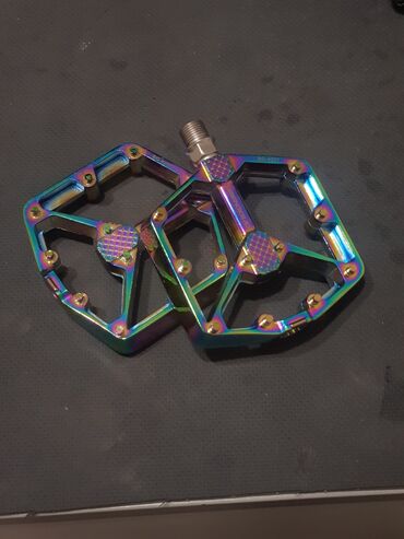 - Педали платформенные, анодирование “oil slick” (радужное). Корпус из легкосплавного алюминия с сетчатыми площадками и сменными шипами по периметру для уверенного зацепа. Плоский профиль, широкая опорная площадь. Ось под стандартную резьбу 9/16". На корпусе маркировка BG-4207. Подходят для МТБ/дёрт/стрит/коммьют.