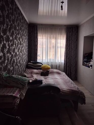 - Просторная гостиная с большим окном, плотными шторами и местом под ТВ-зону.