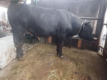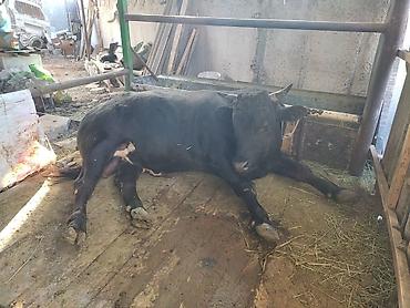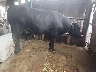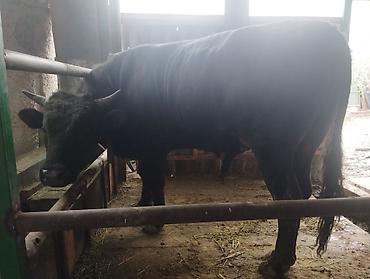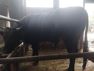 Бык молодняк, черной масти, рогатый. Содержится на привязи в стойловых условиях, кормление грубыми и сочными кормами (на фото у кормушки с сеном). Плотное телосложение, развитая грудь и спина, широ...