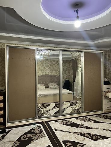 - Шкаф-купе с 4 раздвижными дверями: две зеркальные центральные створки с декоративным узором и две глухие панели под кожу. Алюминиевый профиль, широкие направляющие.