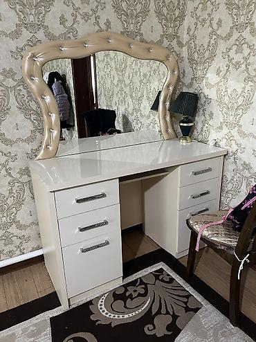- стол с большим зеркалом фигурной формы и мягкой обивкой по периметру. Рабочая поверхность глянцевая, по три выдвижных ящика с каждой стороны.