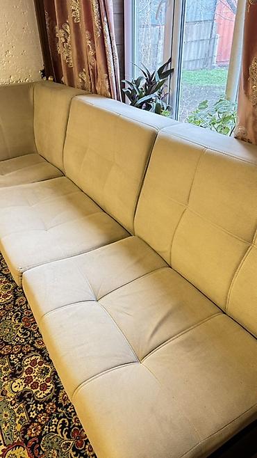 Угловой раскладной диван - Форма: Г‑образный, с мягким угловым модулем. - Механизм трансформации: выкатной — образует ровное спальное место (показано на фото). - Обивка: ткань бежевого цвета с нен...