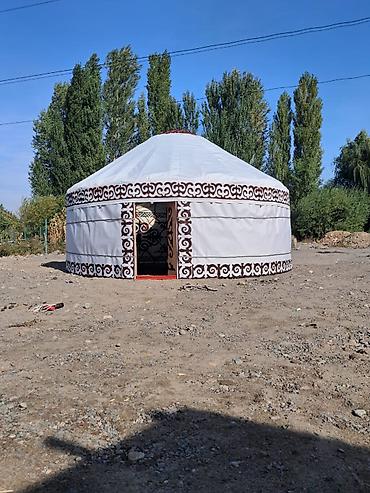 - Традиционная круглая юрта с конусной крышей, наружная обтяжка — белая с орнаментом (варианты отделки: коричневый или красный узор).