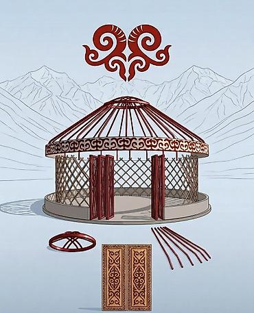 - Каркас: решётчатые стены (кереге), радиальные стропила (уык) и центральное кольцо (шанырак/түндүк) — обеспечивает устойчивость и быструю сборку.