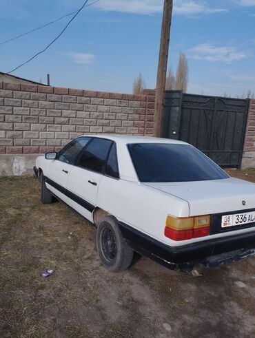 Audi 100 (C3), седан, белый цвет с черными молдингами и бамперами. Киргизские номера. Тонированные боковые и заднее стекла. Черные штампованные диски, зимние шины Cordiant Polar 185/70 R14 (виден рисунок протектора).