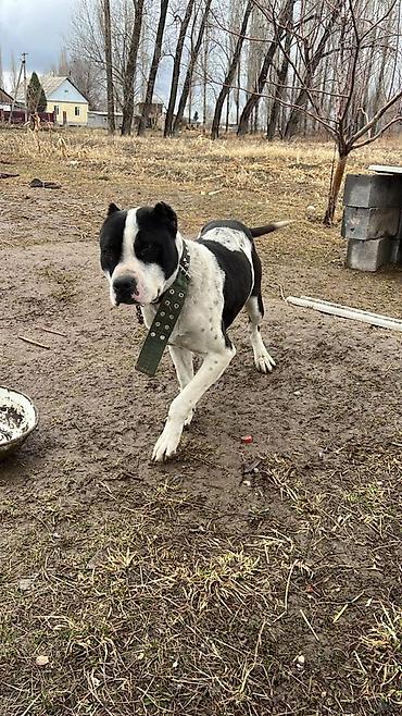 Только вязка Продажа пары собак крупного типа (на фото двое взрослых кобелей/сук смешанных пород). Окрас: один черно‑белый пегий, второй серый тигровый/серо‑коричневый. Короткая шерсть, мощный костяк, крепкая мускулатура. Средне‑высокая активность, хорошо ориентируются на человека, подходят для охраны двора/территории. Содержались в вольере на цепи, привычны к уличному содержанию, не боятся шума, уверенно держатся в незнакомой обстановке.