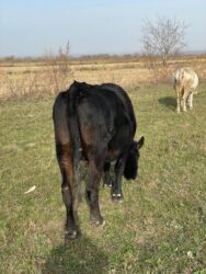 Молодая телка черного окраса с белыми отметинами на ногах и животе. Компактное телосложение, крепкие ноги, ровная спина. Небольшие рога. На фото — в недоуздке, спокойно стоит на привязи. Подходит д...