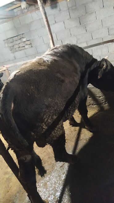 Бык чёрного окраса, рогатый, на привязи, содержится в отдельном стойле. Крупный, широкая спина и грудь, крепкий костяк, ровные конечности. Кожа и шерсть тёмные, плотные. Уши с бирками. Спокойный ха...