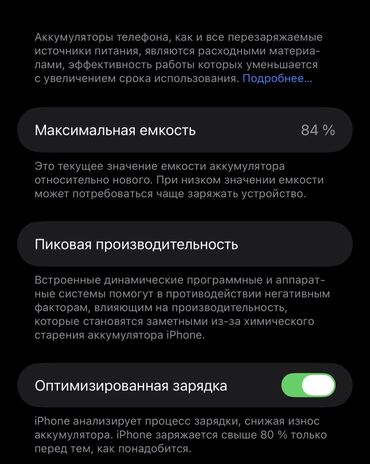 - Аккумулятор: максимальная ёмкость 84% (скриншот «Состояние аккумулятора» прилагается), включена «Оптимизированная зарядка»