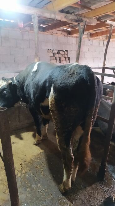 Бычок мясо‑молочного направления, черно‑пестрой масти. Молодой, на рогах, с биркой в ухе. Содержится на привязи в хлеву с навесом, приучен к корыту. Крепкий костяк, развитая мускулатура, ровная спи...