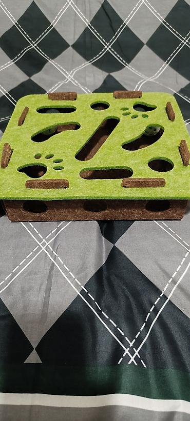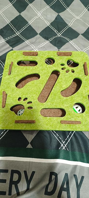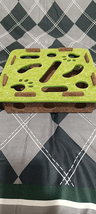 - Короб-головоломка с отверстиями и прорезями для лапок: кошка двигает внутрений шарик/игрушку, тренируя ловкость и охотничий инстинкт.