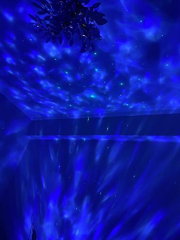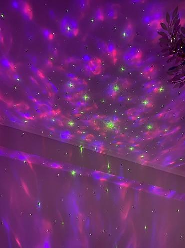 - Создает на потолке и стенах динамичные волны туманности и россыпь звезд (светящиеся зеленые точки/«звезды» + цветные облака).