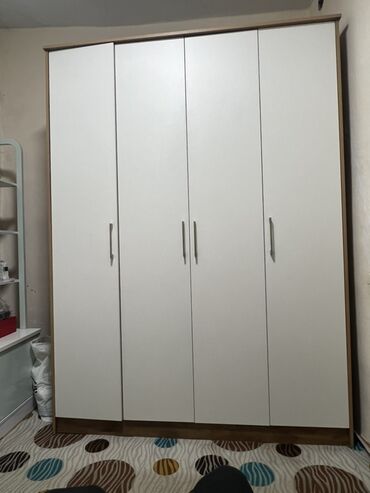 - Шкаф платяной четырехдверный. Гладкие белые фасады, длинные вертикальные ручки, корпус в оттенке дерева. Вместительный — удобно хранить одежду и текстиль.
