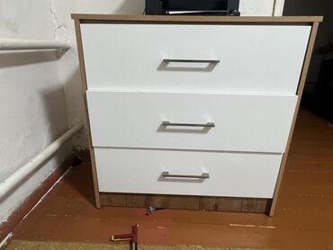- Комод с тремя выдвижными ящиками. Белые фасады, эргономичные ручки, устойчивый корпус.