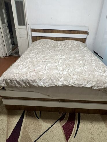 - Двуспальная кровать с высоким изголовьем. Декор горизонтальными белыми планками, основание в цвет дерева. Подходит под стандартный матрас двуспального размера.