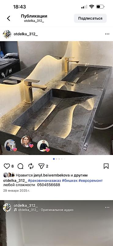 - Изделия на заказ: столешницы и раковины сложной формы из камня, встроенные решения для хранения, ТВ-панели.