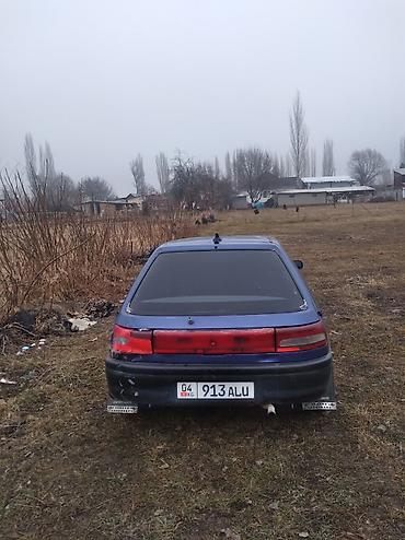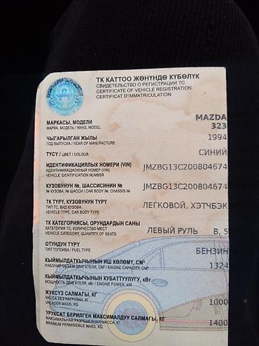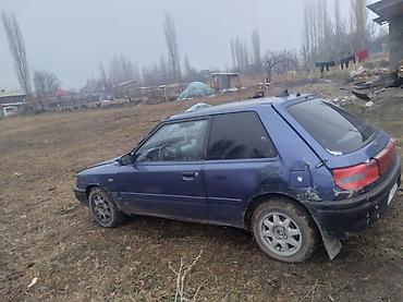 Белый седан Mazda 323 (серия BA, середина/конец 1994х). 4 двери, передний привод. Номерные знаки KG (Кыргызстан), регион G8. Экстерьер и детали: - Цвет: белый - Кузов седан - Передний бампер с кру...