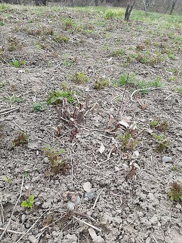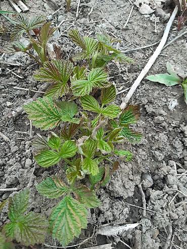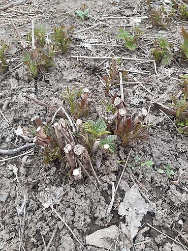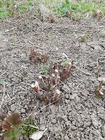 - Сортовая малина, кустовая посадка. На фото — мощные корневые пеньки после обрезки с активными весенними побегами.