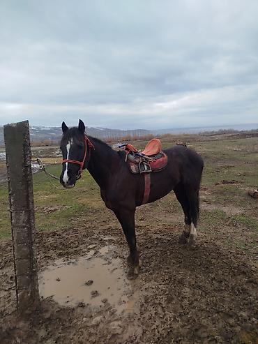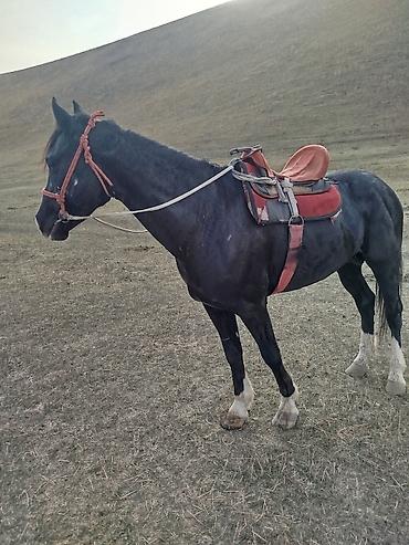 Лошадь верховая, темно-гнедая/черная масть с белой отметиной на лбу и белыми чулками на ногах. Оснащена полным комплектом рабочей упряжи: