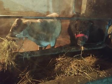 - Два телёнка разной масти (чёрный с густой шерстью, светло‑бурый), содержатся в стойле.