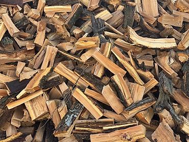Дрова колотые, в чурках и поленьях разной толщины. Породы смешанные лиственные (видно древесину твёрдых пород и молодые стволы/ветви). Поленья распилены и расколоты на удобные отрезки для печей, ка...
