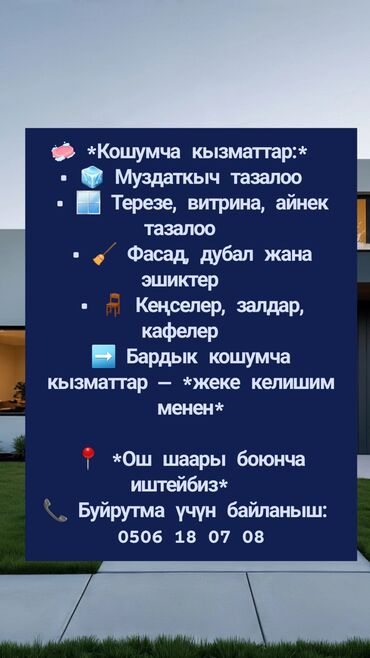 Клининговые услуги AKJOL CLEANING (по Бишкеку) Профессиональная уборка: - квартир, домов, офисов, коттеджей - коммерческих объектов и помещений - мытьё окон Дополнительно: - химчистка мягкой мебе...