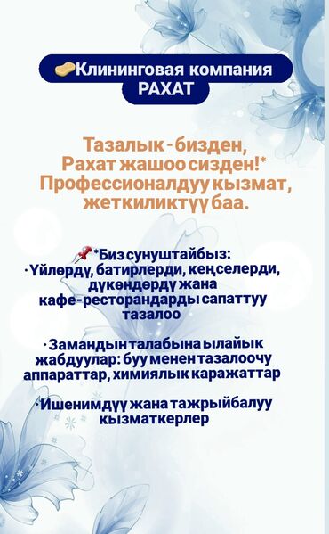 Клининговая компания...Сокулук эксперт компания..Со своими оборудованием... Генеральная,,,,после ремонта,,поддерживающая окошка,,влажная,,люстры,,шторы,,,+ стирка,,,гляжка... Заранее предупреждаем...