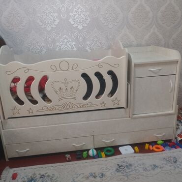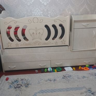 - Кроватка-трансформер с декоративной передней стенкой (резной узор с короной). Под кроватью — два выдвижных ящика для хранения.