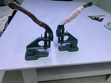 В комплекте на фото — два одинаковых пресса; насадки/матрицы подбираются под нужный тип фурнитуры. Компактный размер позволяет работать на обычном столе; усилие передаётся плавно, ход рычага длинный для точной подпрессовки.