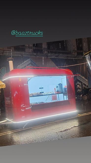 Продаётся мобильный фудтрак (прицеп-кафе) в ретро-стиле, ярко‑красный, с панорамным окном-выдачей и откидным козырьком.